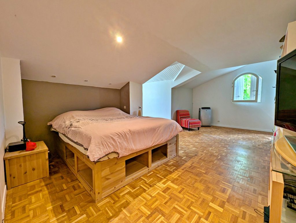 Elle se compose, d’un vaste salon-séjour de près de 96 m², salle à manger, cuisine aménagée et équipée, d’un cellier et buanderie, salle de sport, Jacuzzi, salles d’eau et salle de bains, cinq chambres dont 2 suites parentales, un bureau.