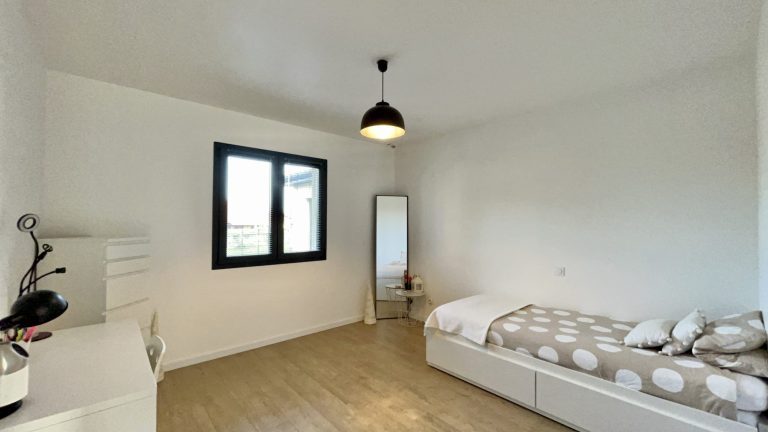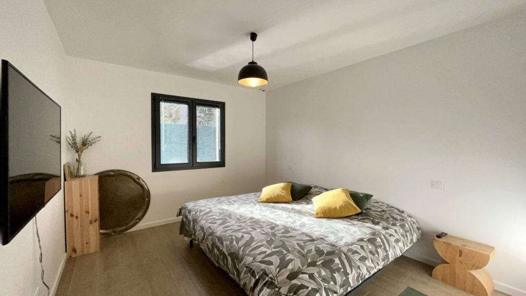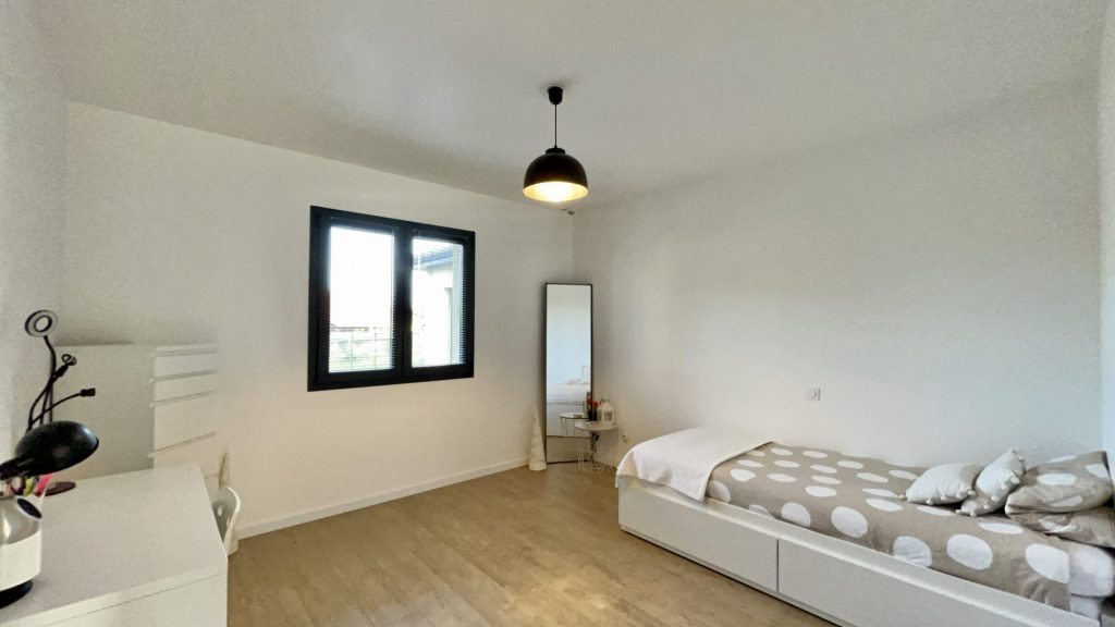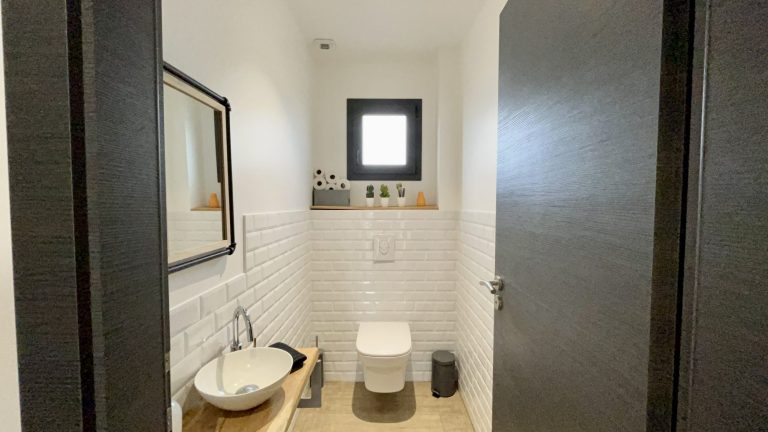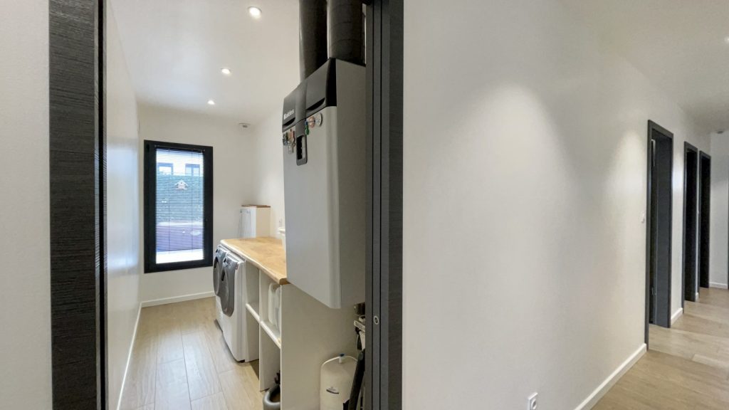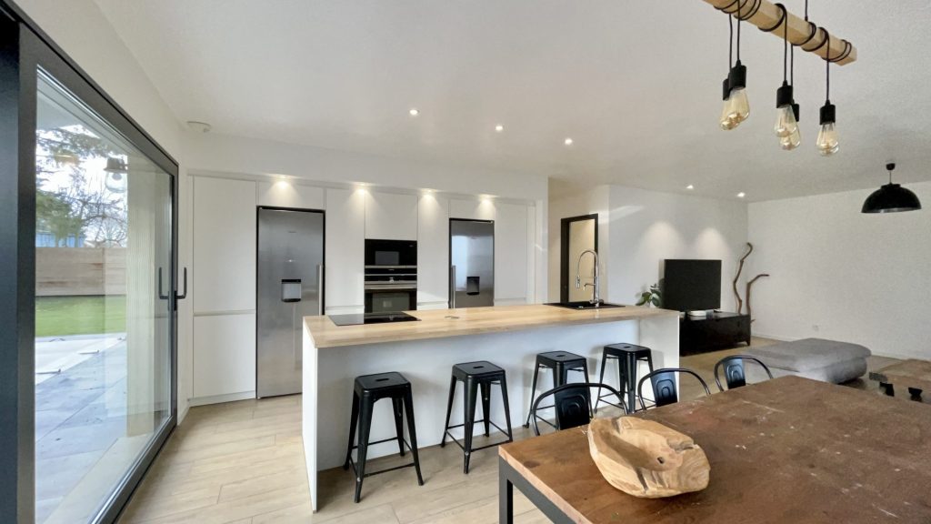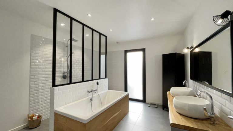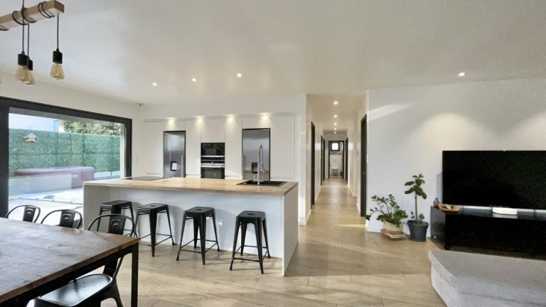 Elle comprend une cuisine équipée ouverte sur un grand salon séjour, un bureau, 3 chambres, une magnifique salle de bain avec douche et baignoire, un WC, une pièce dressing, une buanderie, un grand garage et un jardin intime sans vis à vis avec piscine.
