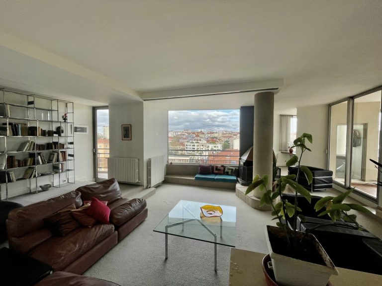 L’appartement avec terrasses propose une incroyable et magnifique pièce de vie de 65 m2 avec une intégration extremement subtile et intime de toutes les différentes fonctions ( Terrasses, Bibliothèque, salle à manger, séjour, bureau, espace cheminé ) chacun de ces espaces proposant des panoramas uniques de la colline de la Croix Rousse jusqu’à la colline de Fourvière et les monts du Lyonnais.